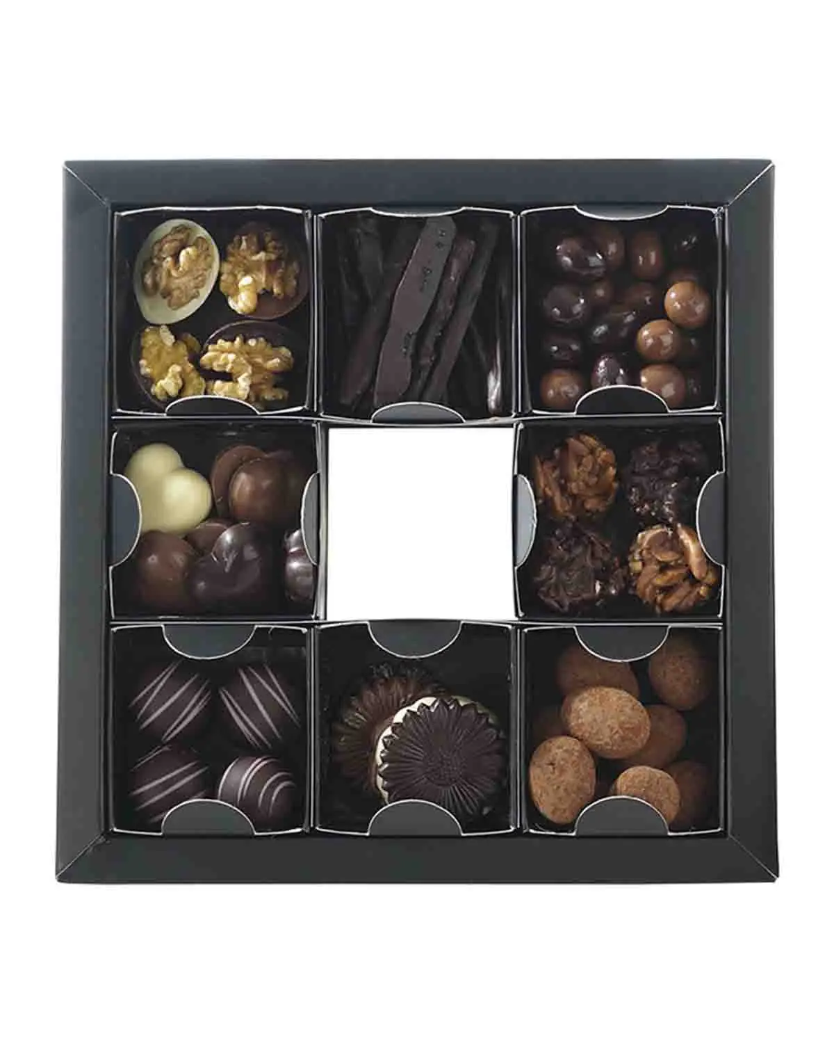 Nueces: Rellenas de praliné (Negro, Leche, Blanco).