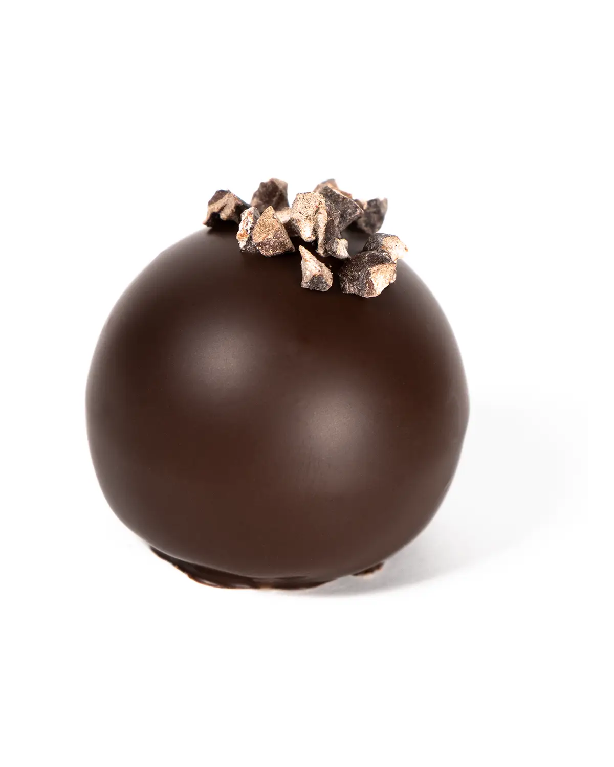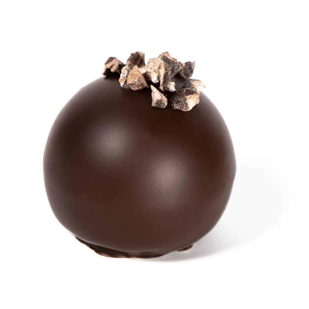 Al morder la trufa, la untuosidad de la crema contrasta violentamente con el crujido duro y seco de los nibs. Cada vez que masticas uno, liberas una micro-explosión de amargor noble y aroma a torrefacto que resetea el paladar y alarga el sabor del cacao durante minutos en la garganta.