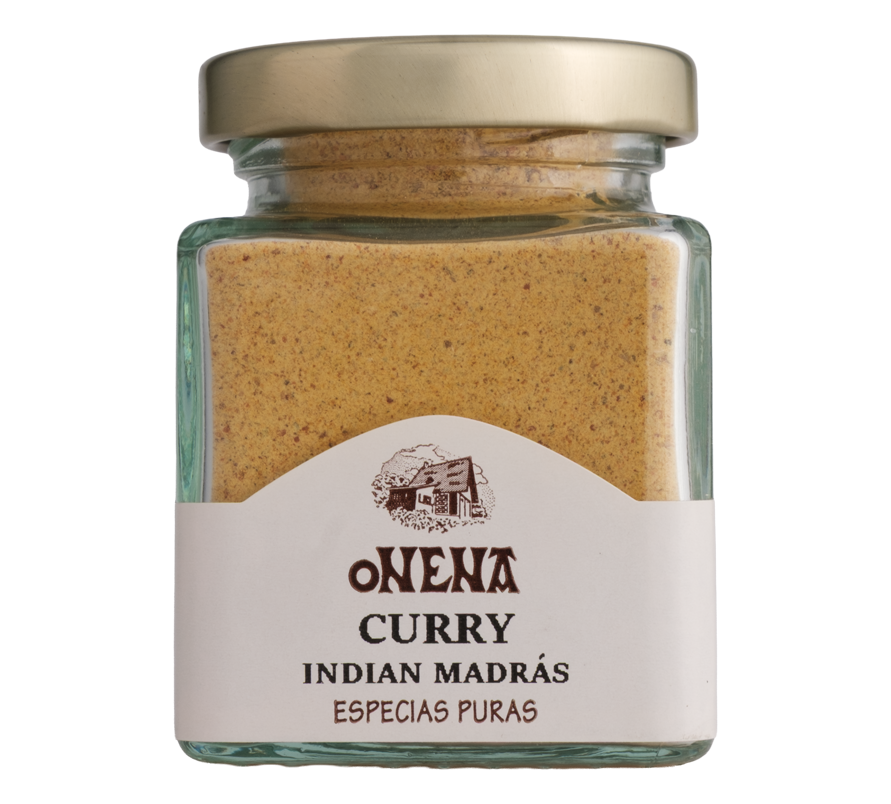Curry Indian Madras Onena (45gr.) — mezcla natural de especias intensas y picantes. Sabor profundo y exótico, ideal para carnes, arroces y guisos.