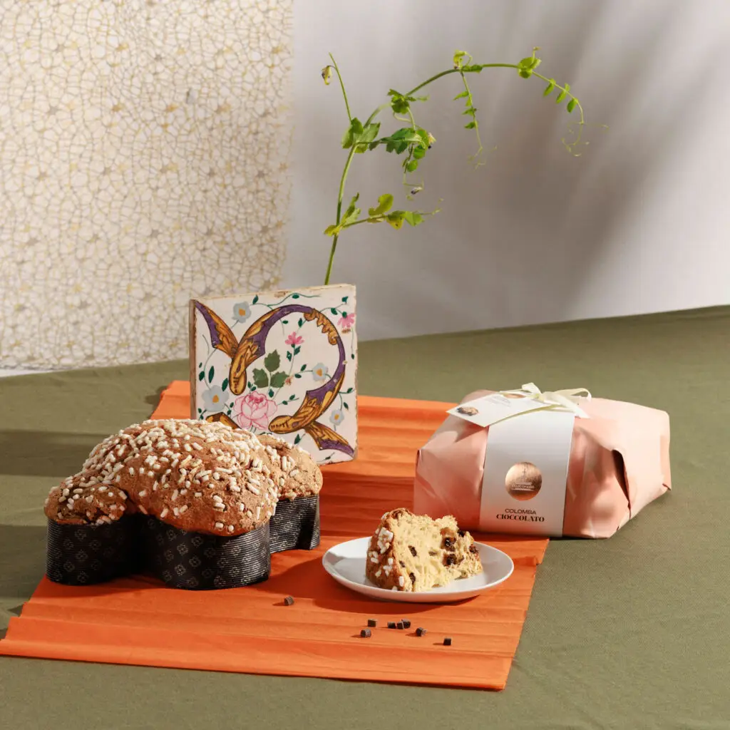 Lo que sorprende al cortar esta Colomba es la generosidad. No hay que buscar el chocolate con lupa. Las “gocce” (gotas) de chocolate están repartidas uniformemente. Al morder, encuentras tres texturas: