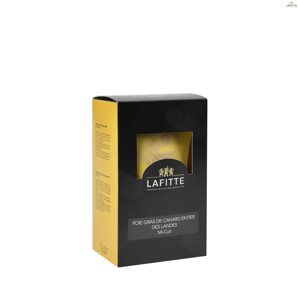 Comprar Micuit Entier de Foie Gras Lafitte siempre es una buena opción pues el foie gras de pato Micuit Lafitte es elaborado de una manera tradicional. En el departamento francés de las Landas a partir de 100% foie gras de pato, sal, pimienta y otras especias. En su producción no se incluye ningún tipo de aditivo ni conservador, además el pato es engordado a partir del mejor grano de maíz entero. Esta receta artesana ha recibido la medalla de plata en el Concours General Agricole de Paris. El micuit de pato Lafitte hace un excelente maridaje con vinos blancos de Sauternes, así como vinos blancos Tokaji.