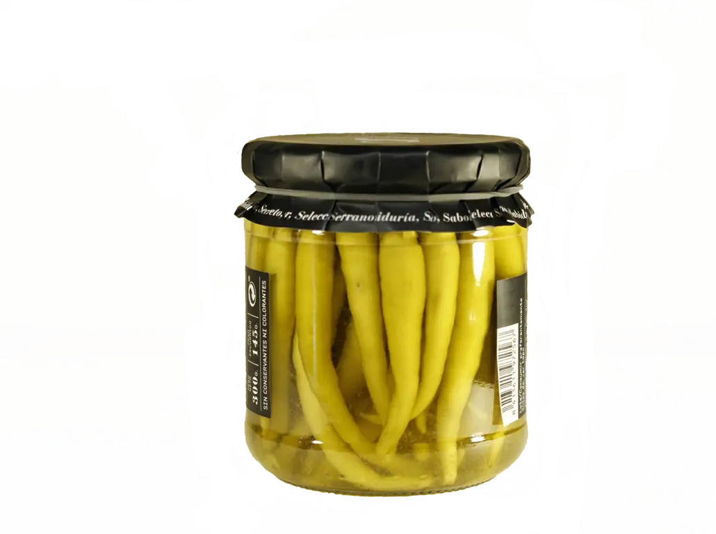 El gran defecto de una guindilla barata es la piel dura, esa que se queda en la boca como un plástico después de masticar. Conservas Serrano selecciona variedades de piel finísima. Al comerlas, notas el crujido inicial, pero luego la piel desaparece, dejando solo la carne tierna impregnada de vinagre. Su color verde amarillento es natural, sin colorantes artificiales. Son recolectadas a mano en su momento óptimo de ternura, antes de que se vuelvan fibrosas o demasiado grandes.