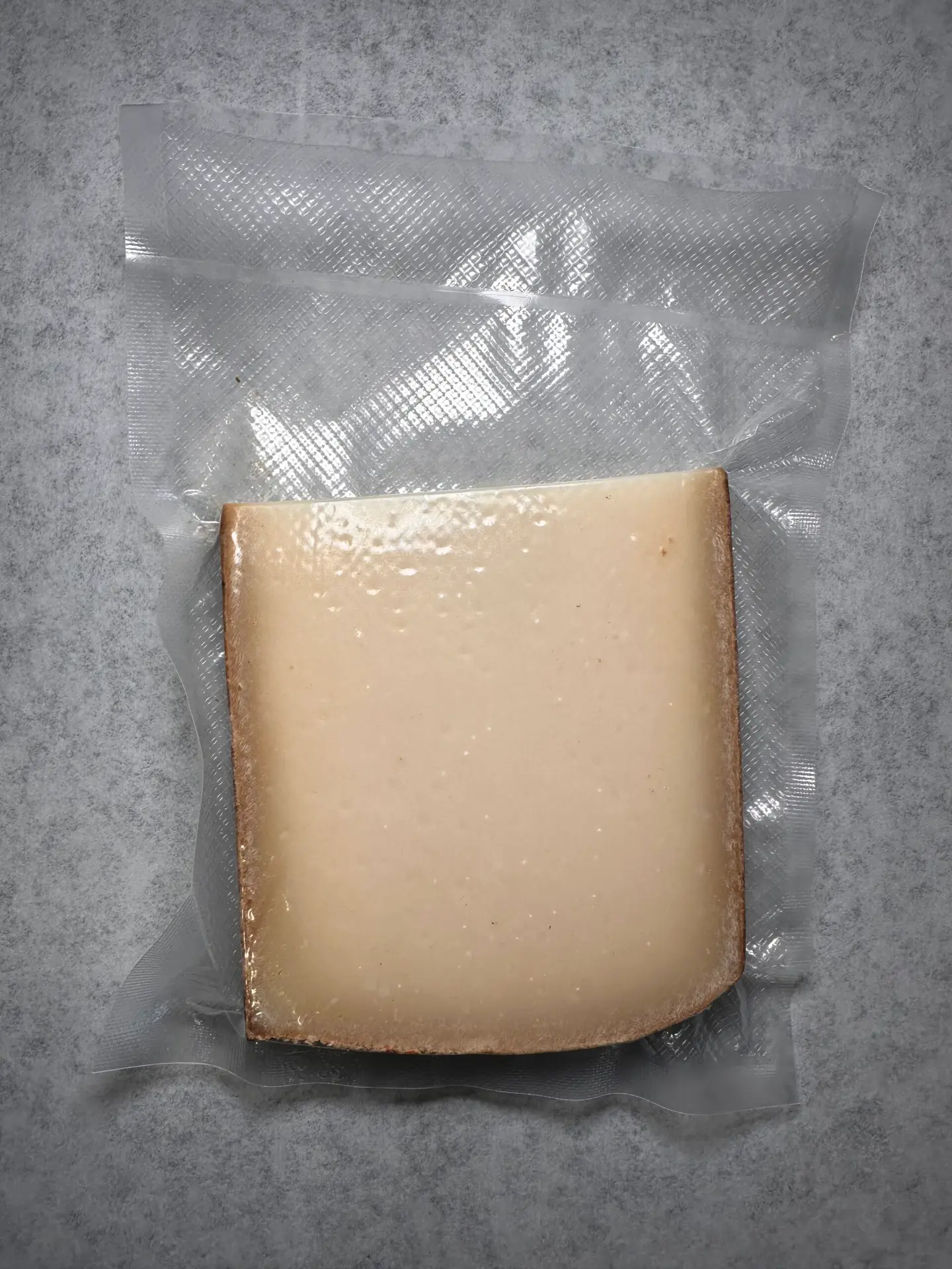 Nos aseguramos de envasar la pieza inmediatamente al vacío tras el corte. Este método es crucial para un queso de esta edad: